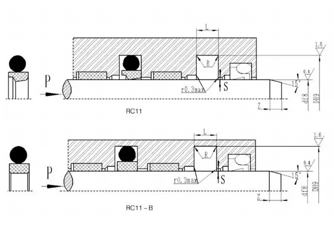 RC11-B از یک حلقه آب بندی مستطیل شکل PTFE پر شده و یک حلقه لاستیکی O شکل ، مناسب برای آب بندی فشار دو طرفه با حرکت مجدد هیدرولیک تشکیل شده است. حلقه O نیروی شعاعی را فراهم می کند و سایش حلقه آب بندی را جبران می کند. معمولاً در رابطه با حلقه راهنما استفاده می شود. شیارهای تقسیم شده (باز) باید برای قطرهای میله کمتر از 30 میلی متر استفاده شوند. ویژگی ها: